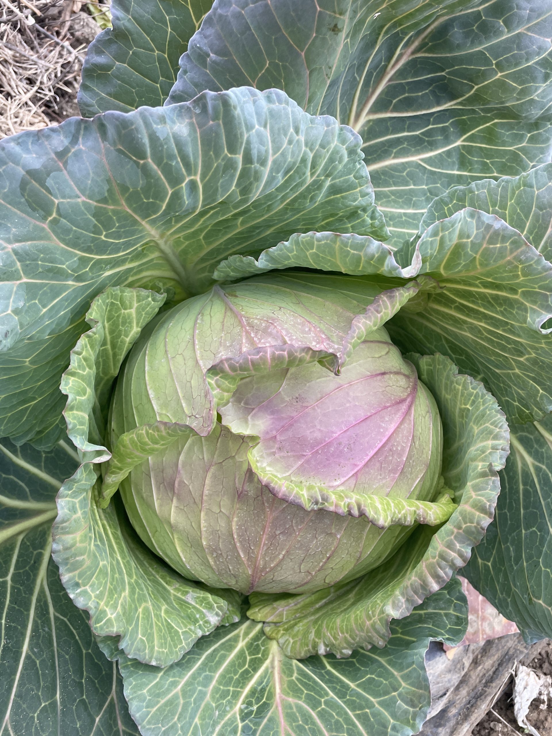 キャベツ君、寒すぎて「凍ってたまるかー!」と糖分を貯め込み、その防御反応でポリフェノール(アントシアニン)を出しちゃったみたい。 人間が寒さで顔を青くするなら、キャベツは寒さで顔を紫にするんですね。笑