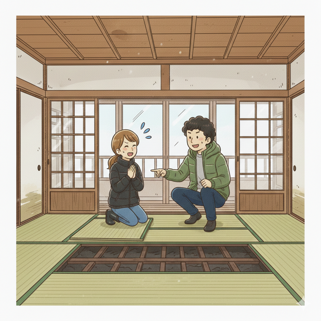 - 畳がベコベコ…: 数年の空き家期間は伊達じゃない。歩くたびに波打つ畳。これ、めくったらどうなってるの…?(見たくないけど見なきゃいけない現実)
