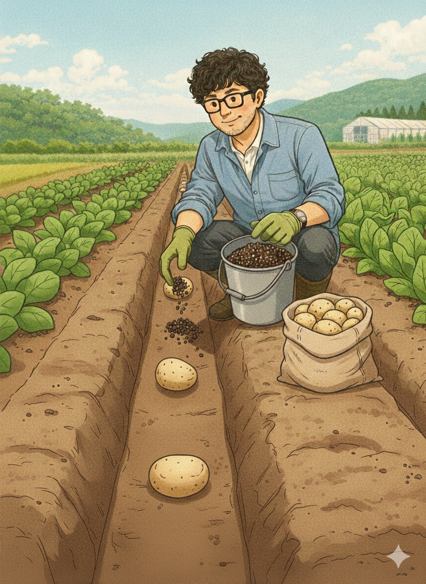 - やり方: 種芋と種芋の**「間」**に肥料を置く。