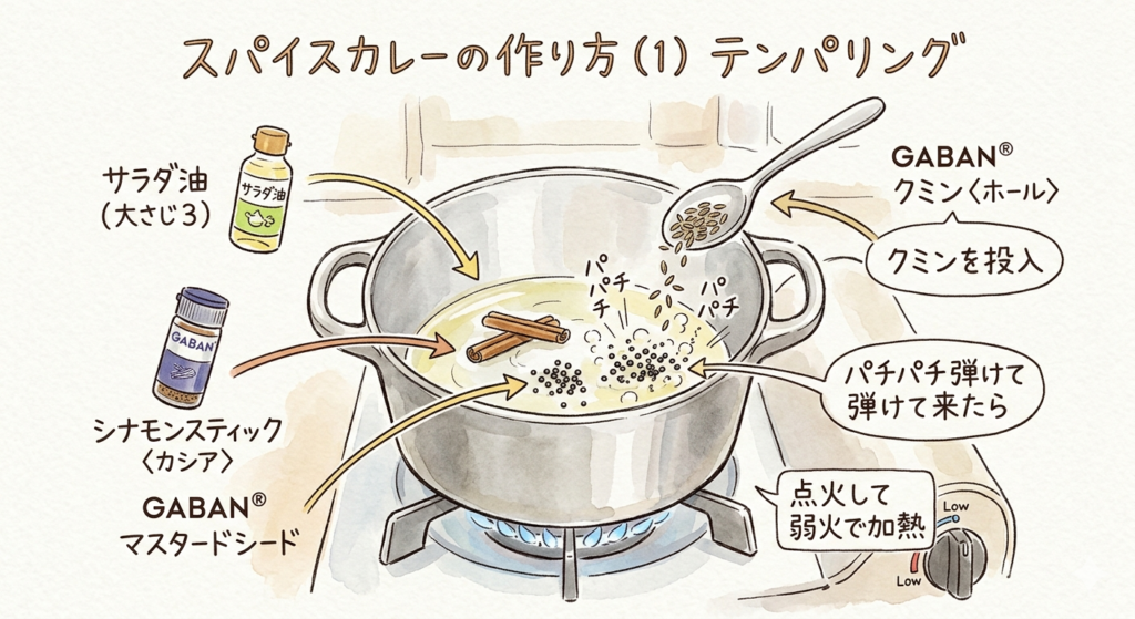 鍋にサラダ油を入れ、シナモンとマスタードシードを入れてから点火します。弱火で加熱しマスタードシードがパチパチ弾けて来たらクミンを投入します。