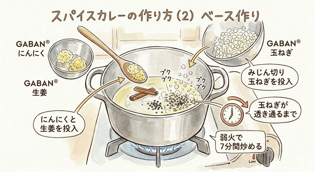 クミンから気泡が出てきたらにんにくと生姜を入れ軽く炒めます。良い香りがしてきたらみじん切りにした玉ねぎを入れ弱火のまま7分間炒めます。