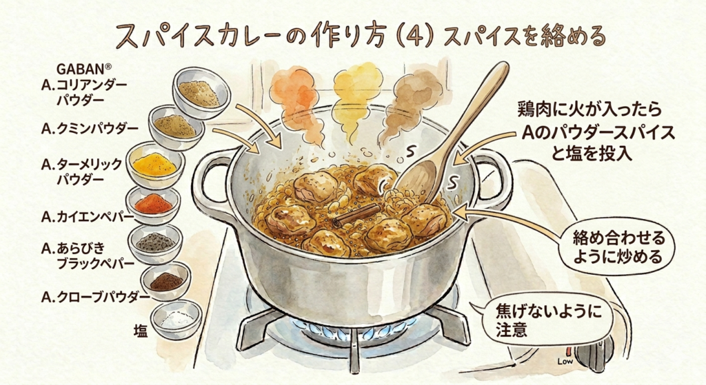 鶏肉に火が入ったらAのスパイスと塩を入れ、絡め合わせるように炒めます。