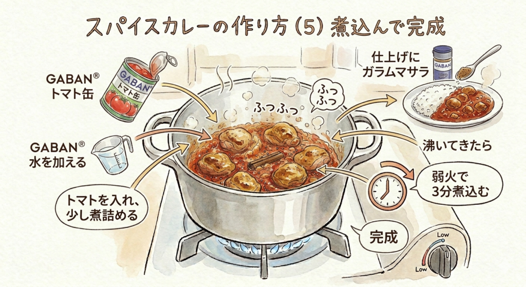 トマトを入れ、少し煮詰めたら分量の水を加えます。ふつふつと沸いてきたら、弱火のまま3分煮込んだら完成。